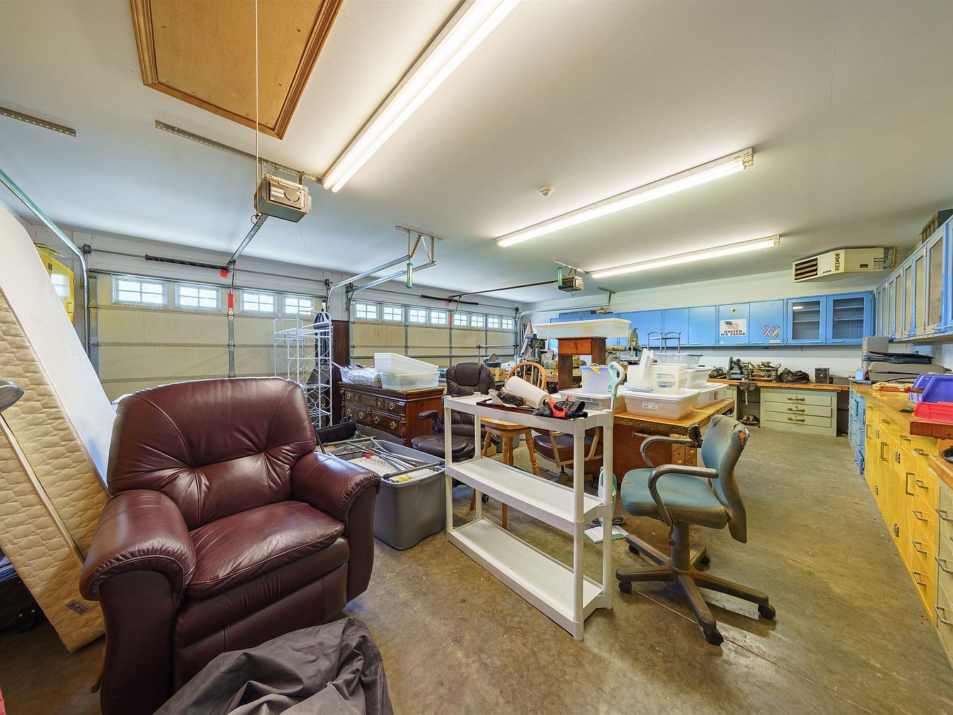 This expansive garage integrates practical storage and work areas with natural light filtering through the upper garage windows. The space features a polished concrete floor, multiple fluorescent light fixtures for bright illumination, and walls lined with built-in cabinetry painted in pastel blue and yellow tones. Various furniture pieces such as a brown leather armchair, office chairs, and a wooden dining chair add to its multifunctional use. Workbenches and shelving units are scattered throughout, indicating a blend of storage, workshop, and casual seating purposes within this utilitarian setting.