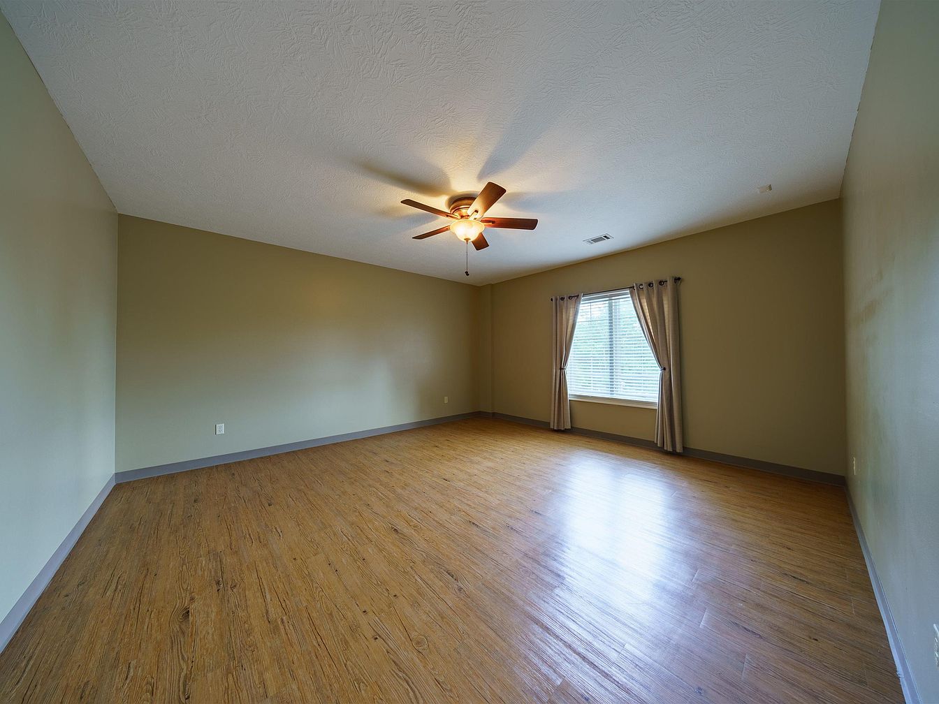 This expansive bedroom features smooth hardwood flooring that adds warmth and texture to the room. The walls are painted in a muted olive tone, bordered with subtle gray baseboards that add understated sophistication. A large window with light beige curtains allows natural light to filter softly into the space, highlighting the clean, cozy atmosphere. The ceiling is finished with a textured pattern, and a ceiling fan with wooden blades and central light provides both functionality and a traditional touch. The room’s open, uncluttered layout offers versatility for various furnishing arrangements and decor styles.
