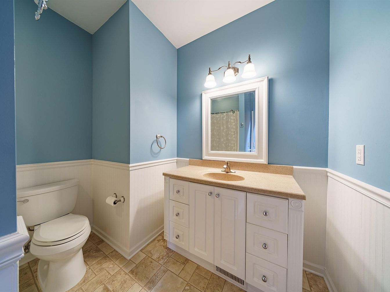This bathroom features a calming blue upper wall paired with white beadboard wainscoting, creating a fresh and classic look. The white vanity has a beige countertop with an under-mount sink, offering ample storage through multiple drawers and cabinet doors with chrome knobs. Above the vanity, a large framed mirror is complemented by a triple-light fixture with frosted glass shades, providing soft illumination. The beige tile floor with a subtle pattern adds warmth and texture, while a white toilet sits neatly next to the vanity. The layout is compact yet functional, emphasizing clean lines and simple elegance.