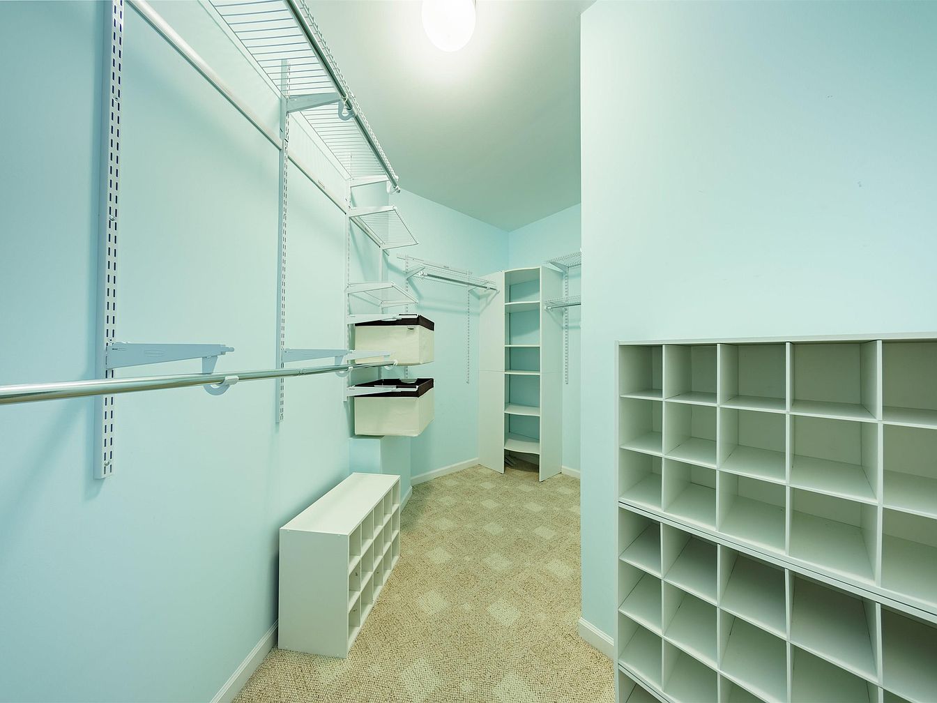 This walk-in closet features a spacious layout with a light, airy color palette centered on soft blue walls complemented by neutral beige carpeting. The room is designed with multiple white shelving units and cubbies for organized storage, including two sets of open cubby shelves positioned at different heights for shoes or accessories. Wall-mounted wire racks and shelves provide ample hanging and folded garment space. The closet’s design emphasizes functionality with a clean, minimalist aesthetic, ensuring every inch is optimized for practical use while maintaining an inviting and uncluttered atmosphere.
