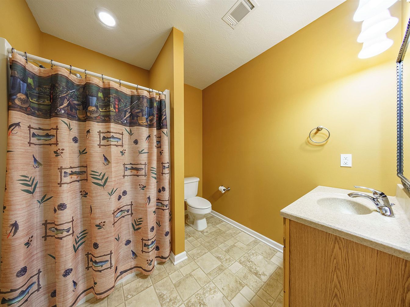 This bathroom section highlights a warm, cozy atmosphere with mustard yellow walls paired with neutral-toned tile flooring featuring a subtle pattern. The space includes a white porcelain toilet tucked into a corner, enhancing privacy. A wood-finished vanity with a light beige countertop houses a sleek chrome faucet under soft lighting, complemented by a trim-edged mirror. The shower area is enclosed by a curtain adorned with nature-themed prints, including fish and leaves, adding an earthy, outdoorsy character. Overall, the layout is simple and functional, with lighting and colors creating an inviting environment.