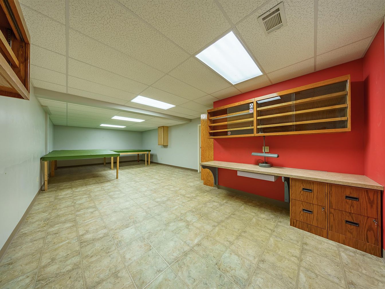 This basement area is designed as a functional workspace with a practical layout. The room features a tiled floor in neutral beige tones that complement the subdued wall colors. One wall is painted a bold red, adding a touch of warmth and character, and serves as a backdrop for a built-in desk area with wooden cabinetry and a glass-fronted shelving unit above. The ceiling is a standard drop-tile with fluorescent panel lighting, providing even illumination. On the opposite side, there is a large table with green felt covering, suggesting it could be used for crafts, hobbies, or game setup, enhancing the space’s versatility.