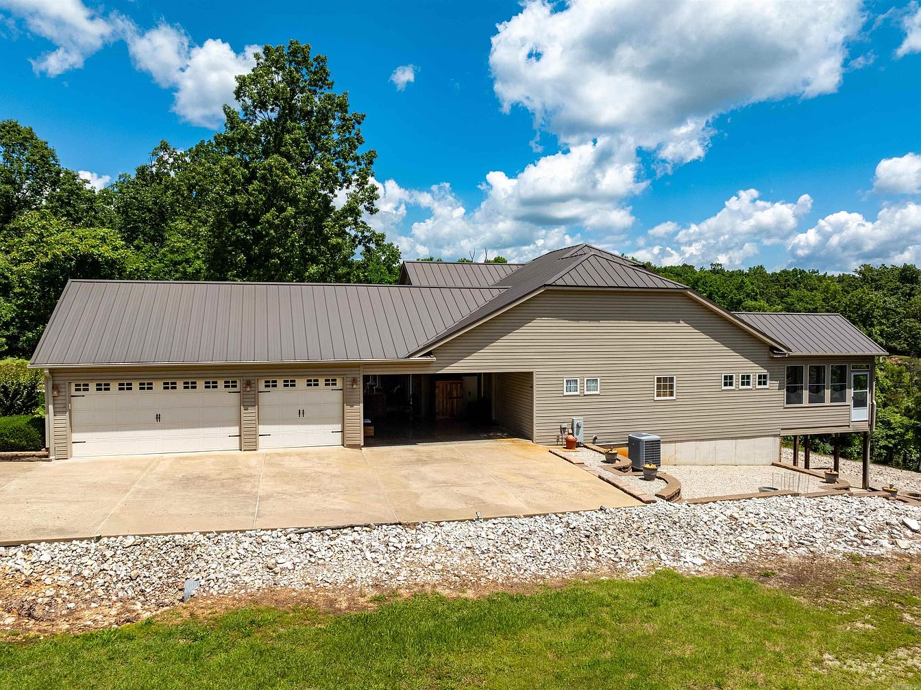 This view highlights a spacious three-car garage attached to the home, featuring beige siding complemented by a sturdy, matte gray metal roof. The driveway area is expansive and paved in smooth concrete, bordered by a bed of white decorative stones which separate the driveway from the grass and natural landscaping. The home showcases a modern yet rustic aesthetic, blending harmoniously with the surrounding lush green trees and bright blue sky with fluffy white clouds. Architectural details include multiple small windows on the side wall allowing natural light, and a slightly elevated section supported by vertical posts, adding visual interest and functionality.
